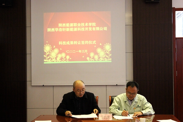 2021年3月11日下午,陜西華浩軒新能源科技開發(fā)有限公司與陜西能源職業(yè)技術(shù)學(xué)院科技成果轉(zhuǎn)讓簽約儀式在華浩軒公司隆重舉行,陜西能源職業(yè)技術(shù)學(xué)院黨委副書記任向明、華浩軒公司黨總支書記、董事長(zhǎng)王峰分別代表雙方在轉(zhuǎn)讓協(xié)議上簽字。陜西能源職業(yè)技術(shù)學(xué)院科研信息處處長(zhǎng)師培杰、煤炭與化工產(chǎn)業(yè)學(xué)院副院長(zhǎng)王前進(jìn)、副教授凌潔、高工陳晗、西安石油大學(xué)教授黃鳳林、華浩軒公司財(cái)務(wù)總監(jiān)弓建安、副總經(jīng)理劉彥仁、總工程師郇宇飛參加簽約儀式。